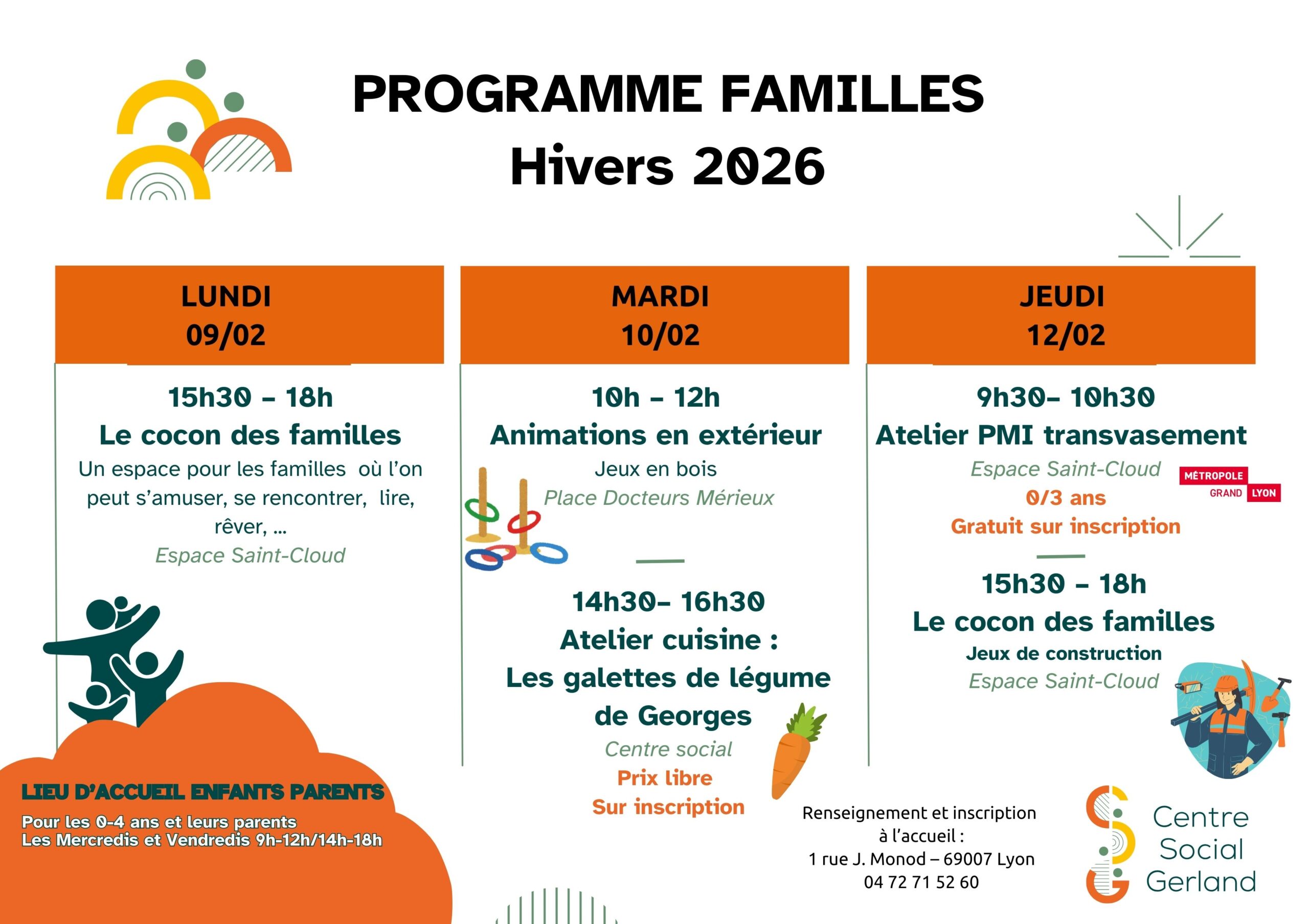 Pour plus d’informations et inscriptions aux activités gratuites, contactez-nous au 04 72 71 52 60 ou à accueil@csgerland.com