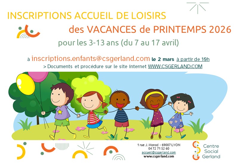 Nous rappelons que seules les familles résidentes du 7ème arrondissement de Lyon sont éligibles aux inscriptions des activités du centre social. Toute autre demande sera étudiée mais non-prioritaire. Pour des raisons pédagogiques, nous encourageons les inscriptions à la semaine complète. Seules les demandes avec un minimum de 3 jours par semaine seront traitées.